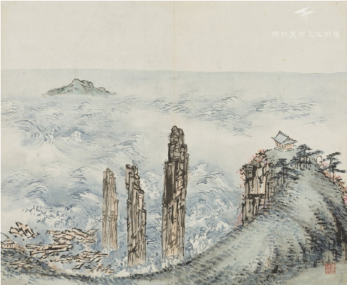 넘실대는 파도의 동세를 위해 교묘하게 완급을 조절한 섬세한 붓질과 수직준(垂直皴)을 활용해 표현한 검붉은 빛의 강렬한 돌기둥과 벼랑, 붓을 뉘어 찍은 미점(米點)으로 그린 반원형의 언덕. 단조롭기 쉬운 원경에 멀리 조각배와 같이 떠 있는 알섬(卵島) 하나를 보태고 하늘과 파도, 해안으로 이어진 창윤(蒼潤)한 빛깔에 붉은 꽃을 더하는 섬세하면서도 공교한 솜씨는 누구도 쉬이 접할 수 없는 도인만의 탁월한 솜씨가 아닌가. 이렇듯 도인의 총석정 그림은 남종화에 기반을 둔 수채화 같은 은은하면서도 고운 화면 구성에다 꼼꼼하면서도 치밀한 선묘로 이루어지는 북종화의 특장을 겸비한 조선 후기의 수작임에 틀림없어 보인다.