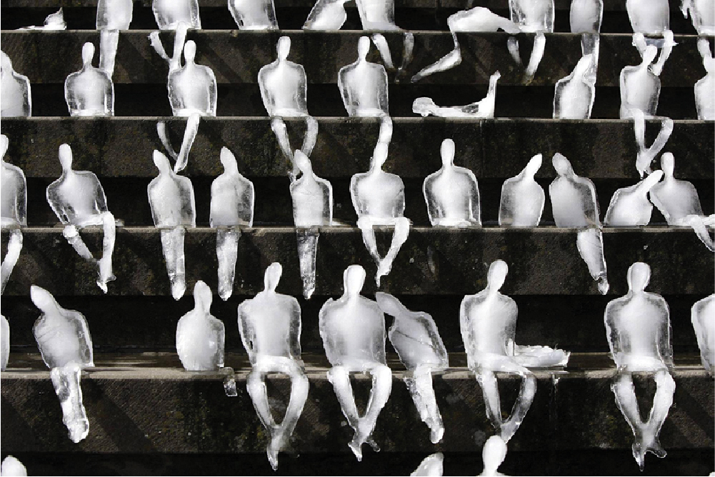 넬레 아제베두는 다양한 도시공간을 배경으로 작품을 제작한다. <최소의 기념비>는 작은 사람 형태의 얼음 조각상을 야외에 전시하는 프로젝트다. 작은 얼음 조각상은 햇빛에 녹아내리고, 결국 흔적만 남은 채 사라진다. 넬레 아제베두는 인류의 운명과 지구는 연결되어 있음을 이야기한다. 점점 더 뜨거워지는 지구에서 녹아내리는 건 빙하만이 아니라, 우리 인간이기도 하다는 강렬한 메시지를 남긴다.