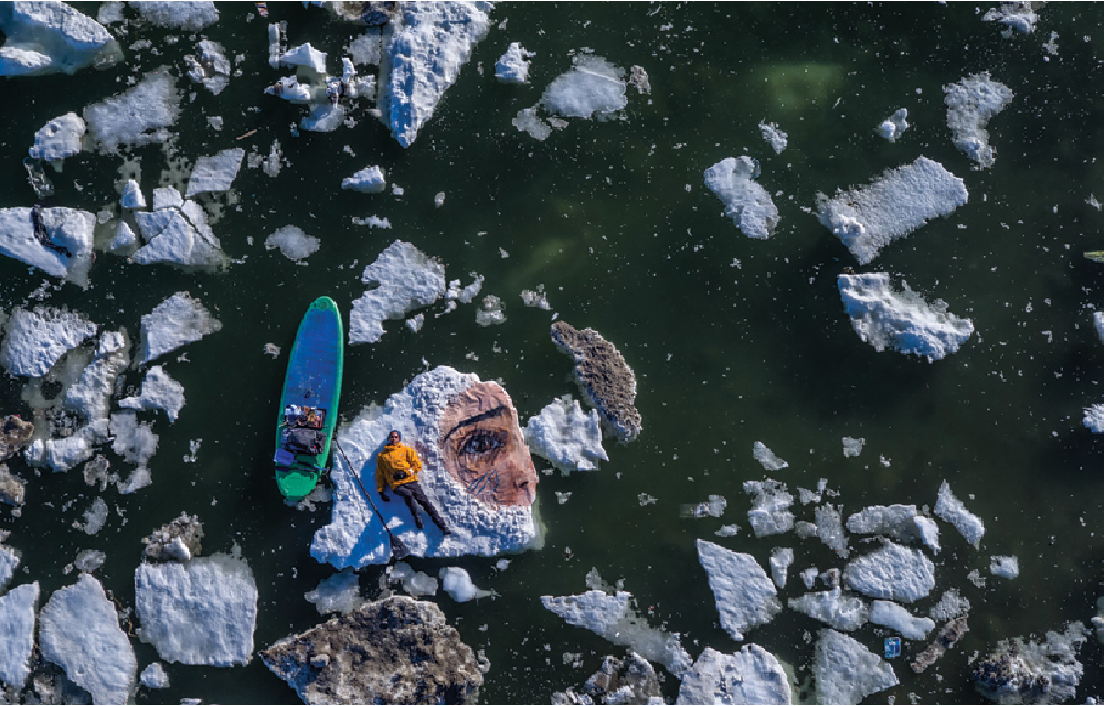 하와이 출신의 서퍼이자 예술가인 션 요로는 때로 벽이 아닌 빙하 위에 그림을 그린다. 하와이어로 ‘경고’를 뜻하는 ‘A’o’ana’는 빙하 위의 인물화로, 결국 깨지고 잠겨 누구도 소장할 수 없다. 차가운 바다 위를 떠도는 작은 빙하 조각은 일주일이면 사라지기 때문이다. 션은 사람들에게 얼음이 녹고 있다는 것을 직접 보여준다. 제목처럼 그의 작품은 사라짐으로써 기후변화를 경고하고 있다.