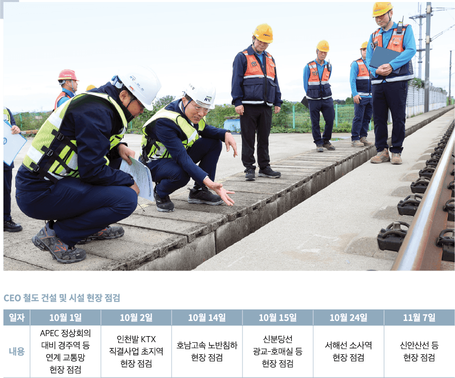 이성해 국가철도공단 이사장은 지난 10월 14일 호남고속철도 신작교~어량교 구간의 노반침하 하자보수 현장 점검에 나섰다. “국민들이 안심하고 철도를 이용할 수 있도록 철도시설관리자로서 책임을 다해주기를 바란다”며, “안전한 철도환경을 조성하는 데 만전을 기해달라”고 당부했다. 지난 10월 1일에는 경주에서 개최되는 제32차 아시아태평양경제협력체(APEC) 회의에 참석하는 21개 회원국 정상 및 대표단 등 약 2만여 명이 주로 이용할 것으로 예상되는 경주역 등 철도시설을 점검했다. 이 이사장은 역사 내 엘리베이터, 대합실 내 참가자 안내 계획 등을 살펴보고 안전 저해 요인과 이용 불편 사항에 대해서는 APEC 정상회의 개최 전까지 개선 완료를 당부했다.