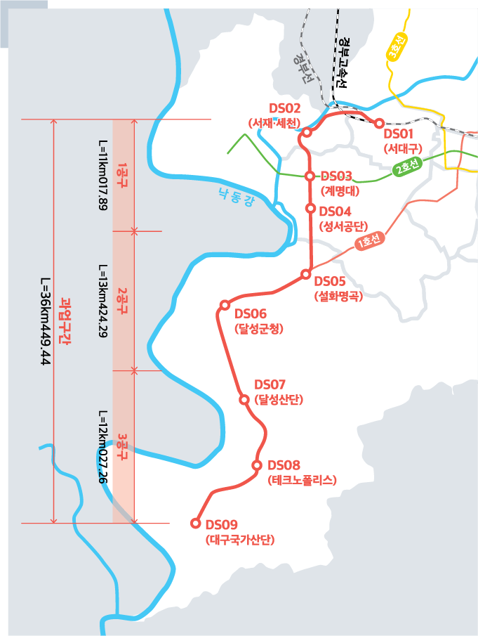 국가철도공단은 11월 11일 대구산업선 철도건설 사업의 적기 개통을 위하여 3개 공구 중 선행 공구인 제2공구(TK) 건설공사를 본격 착수했다. 대구산업선 철도건설 사업은 총사업비 1조 5,538억 원을 투입해 서대구에서 대구국가산단까지 총연장 36.4km 구간을 지하터널로 건설하는 사업으로, 2030년 12월에 개통을 목표로 추진 중이다. 개통 시 서대구역에서 대구국가산단역까지 약 31분이면 이동이 가능하며, 대구권 광역철도와 도시철도 1·2호선 연계를 통한 환승 교통체계 구축으로 지역주민과 근로자의 교통편의가 크게 향상될 것으로 기대된다. 이번에 착공하는 제2공구는 대구시 달서구에서 달성군을 잇는 구간으로 올해 6월 공사계약을 체결했으며, 터널 굴착을 위한 수직구* 공사도 지난 11월 본격 착공했다. 한편, 제1공구(TK)와 3공구(기타)는 설계 및 인허가 협의 진행 중으로 제1공구는 올해 말, 제3공구는 내년 하반기에 공사 계약을 체결할 예정이다.