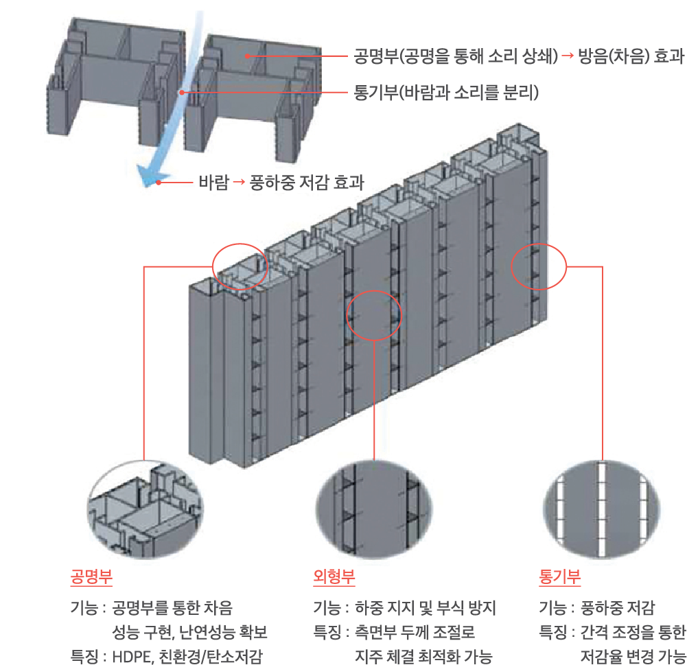 1. 차음 : 소음 잡는 능력, 기본부터 완벽하게!기존 방음벽은 소리를 반사하거나 흡음재(유리섬유 등)를 사용해 소리를 흡수하는 방식으로 소음을 막아 왔다. 이와 다르게 ‘풍하중 저감 흡음형 방음 패널’은 내부에 헬름홀츠(Helmholtz) 공명 원리를 적용한 공명부를 설계했다. 벌집처럼 설계된 패널 내부의 공명부에 소리가 들어가면, 소리끼리 부딪쳐 스스로 사라지게(상쇄) 된다. 이는 기존 기술과 동등하거나 더 우수한 수준의 소음 저감 성능을 확보한다. 차음 성능 결과 500Hz에서 26.3dB, 1,000Hz에서 34.8dB이라는 뛰어난 성능을 입증하며, 방음벽 본연의 임무인 소음 차단에서 완벽한 능력을 보여줬다.