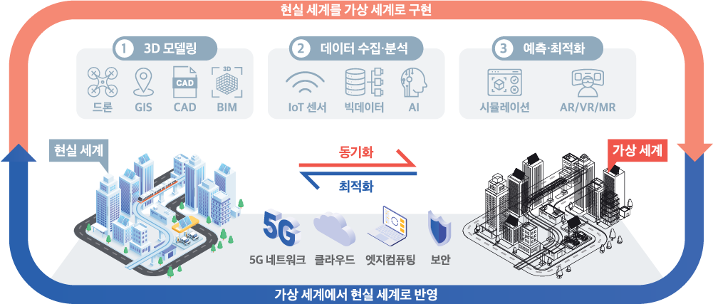 디지털트윈은 물리적 인프라의 센서 데이터를 수집해 가상세계에서 분석 및 예측을 수행하며, 이 결과를 다시 물리 세계에 피드백하는 순환 구조를 가진다. 이러한 순환 시스템을 통해 시설물의 안전성을 확보하고 업무를 자동화하며 최적의 의사결정을 지원한다. 따라서 관리 대상 물리적 객체, 연결 및 센싱, 가상 모델, 분석 및 예측, 그리고 플랫폼을 핵심 요소로 들 수 있다.