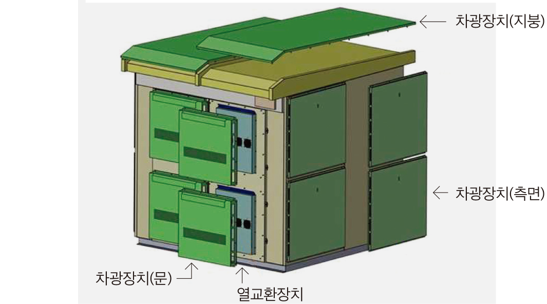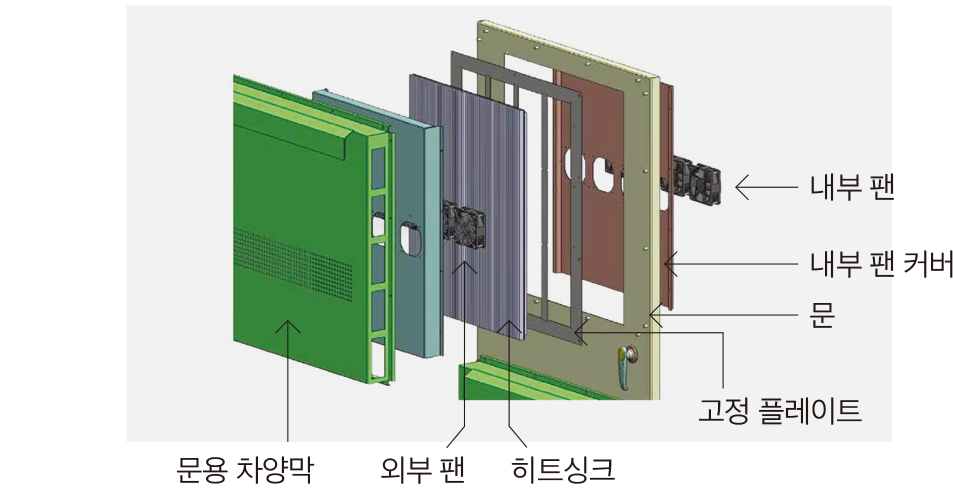 이 기술은 고장의 원인이 되는 오염물질의 통로를 설계 단계부터 차단한다. 밀폐형 전장품 외함은 기존 외함의 환기구와 팬을 없애고, 문과 패널의 이음새, 케이블이 들어오는 입구(인입부) 등을 특수 씰링 처리한다. 이는 외함 전체를 IP65 수준의 거대한 ‘진공 밀폐 용기’처럼 만드는 과정이다. 그런 후 숨구멍이 막혀 뜨거워진 내부를 식히기 위해 앞서 설명한 열교환장치(Heat Sink Assembly)를 결합한다. 특히 현장 점검의 편의성을 위해 열교환장치를 외함 문(Door)에 모듈 형태로 단다. 마치 가전제품의 부품을 갈아 끼우듯, 문제가 생기면 장치 전체를 간편하게 점검하거나 교체할 수 있다. 옥외 설치 시에는 직사광선을 막아주는 차광장치(선셰이드)를 지붕과 측면에 덧대어 열 차단 효과를 극대화한다.