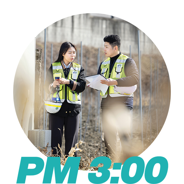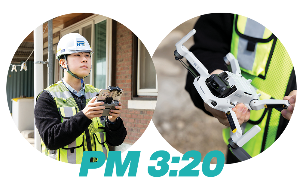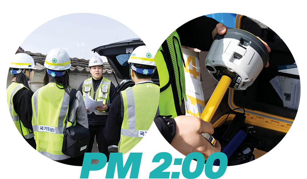 현장에 도착해 차량 문이 열리자 줄자와 레이저 거리측정기, 드론 같은 측정 장비와 태블릿, 안전모·안전화·장갑 등 안전장비가 차례로 모습을 드러냈다. 직원들은 현장에 들어서기 전 대상 구간과 이동 동선, 역할