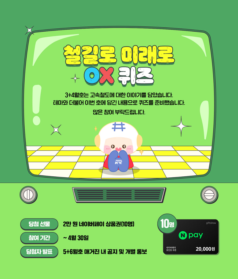 고속철도와 더불어 3+4월호 담긴 내용으로 퀴즈로 준비했습니다. 많은 참여 부탁드립니다.